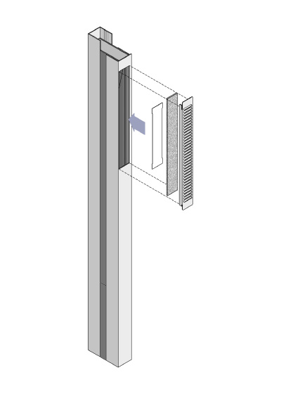 Aireador vertical para cualquier tipo de carpintería. Aireador para entrada de aire exterior instalado en posición vertical en cualquier tipo de carpintería desde 700 mm hasta 3000 mm de altura, entre el marco y el premarco. Adecuado para ventanas con o sin persiana. Permite la ventilación con la persiana bajada. Aireador compuesto de dos perfiles de aluminio de 40 mm de ancho para colocar en el lado derecho o izquierdo, con material fonoabsorbente interior, rejilla exterior y rejilla interior registrable para limpieza o cambio de filtro antipartículas. Disponible en distintas profundidades, desde 100 hasta 180 mm, y en distintas alturas. Este aireador es regulable a 5 o 10 l/s; este ajuste debe hacerse de acuerdo al ajuste total del sistema de ventilación. El aireador se suministra en cualquier color RAL o color especial. También disponible sin lacar.